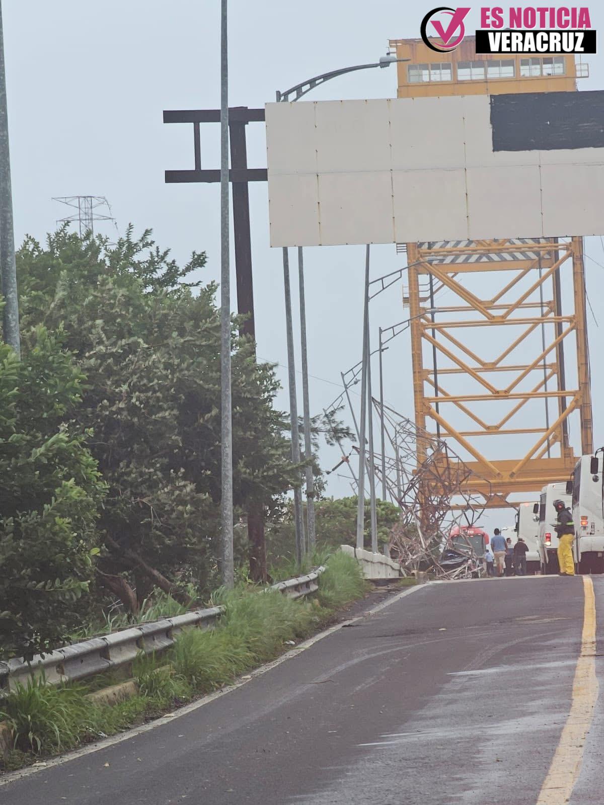 Una torre de energía eléctrica de la Comisión Federal de Electricidad (CFE) en el puente Coatzacoalcos Uno cayó encima de dos unidades, entre ellas, un auto particular y un camión de transporte de personal de Petróleos Mexicanos.