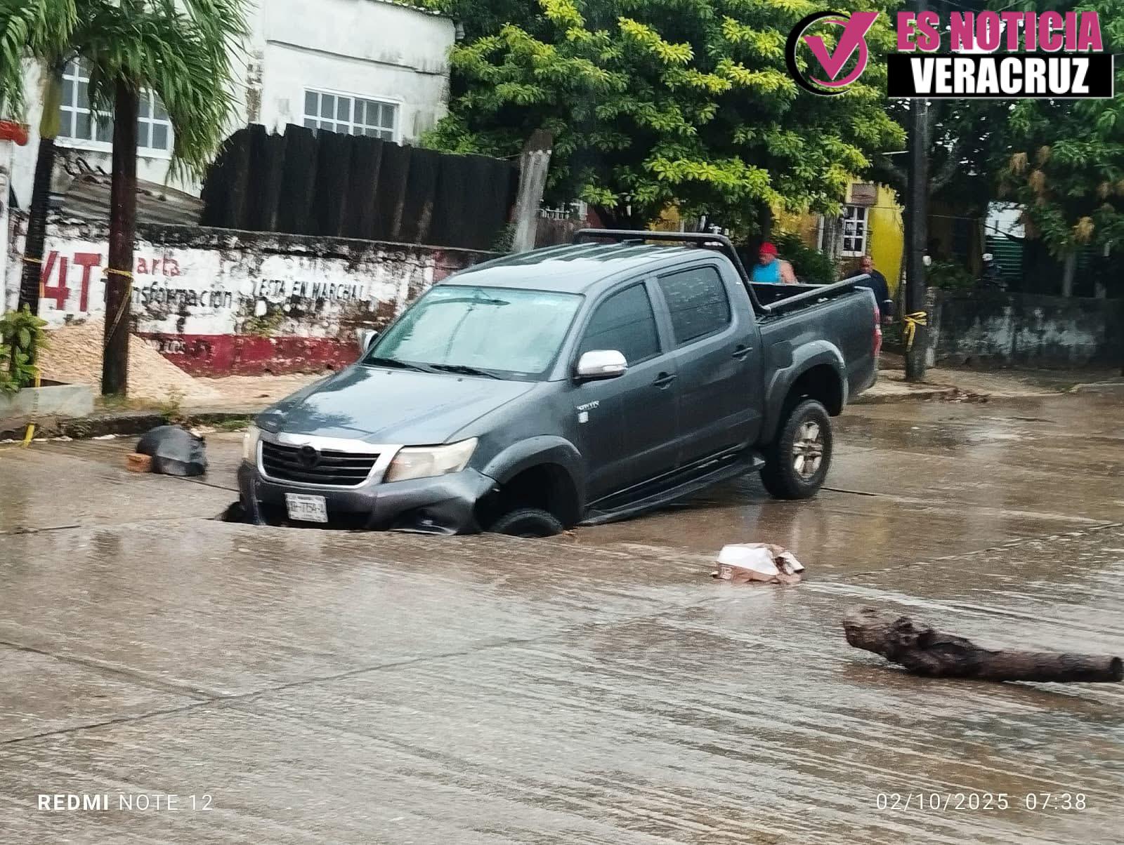 Camioneta termina atrapada en socavón tras lluvias en Coatzacoalcos