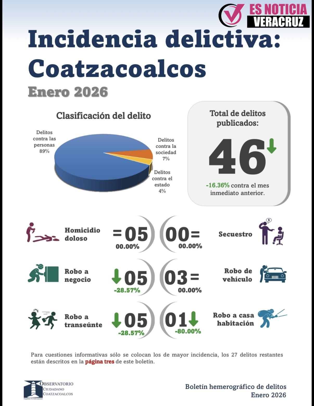 El Observatorio Ciudadano de Coatzacoalcos (OCC) reportó una disminución del 16.36 por ciento en la incidencia delictiva general; en tanto que en homicidios cinco hombres fueron asesinados en enero, lo que enciende los focos rojos en los delitos de alto impacto.