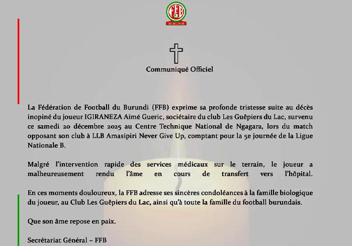 “La Federación de Futbol de Burundi (FFB) expresa su profunda tristeza por el fallecimiento inesperado del jugador IGIRANEZA Aimé Gueric, miembro del club Les Guêpiers du Lac, ocurrido el sábado 20 de diciembre de 2025 en el Centro Técnico Nacional de Ngagara, durante el partido entre su club y LLB Amasipiri Never Give Up, correspondiente a la quinta jornada de la Liga Nacional B”, dijo la Federación de Futbol de Burundi en un comunicado.