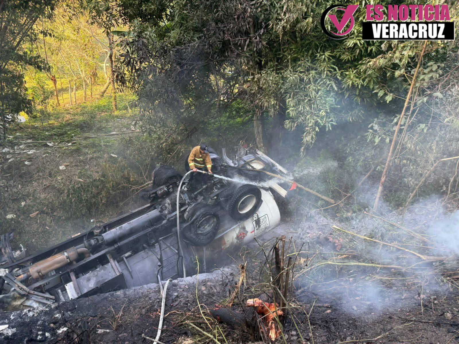 Testigos de los hechos manifestaron; qué el conductor de un camion cisterna de combustible con direccion a Casitas en el municipio de Tecolutla embistió al conductor de una camioneta, que transportaba hoja de maíz, sobre su izquierda en su parte posterior, debido a la falta de precaución y exceso de velocidad por parte del responsable del accidente.