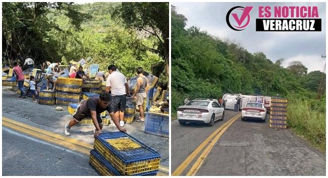 Puente Nacional, Ver.- Un camión cargado de pollos volcó sobre la carretera Veracruz-Xalapa, a donde llegaron decenas de personas que se robaron la mercancía sin que nadie se los impidiera.